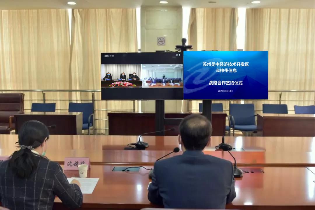 3月18日,疫情期间,神州信息与苏州吴中经济技术开发区视频连线,举办了“云上”战略合作签约仪式。此次双方携手重在推动神州信息(苏州)自主创新示范基地项目顺利落地,打造苏州(太湖)软件产业园成为信创产业全国示范区,助推苏州市信创产业加速发展。苏州吴中经济技术开发区党工委副书记、管委会副主任周学斌,经发局局长沈娟鹃,苏州吴中太湖软件产业园发展有限公司总经理吴秦,以及神州信息总裁李鸿春、副总裁王平和金融研究院院长赵巍等领导一同出席了本次活动。