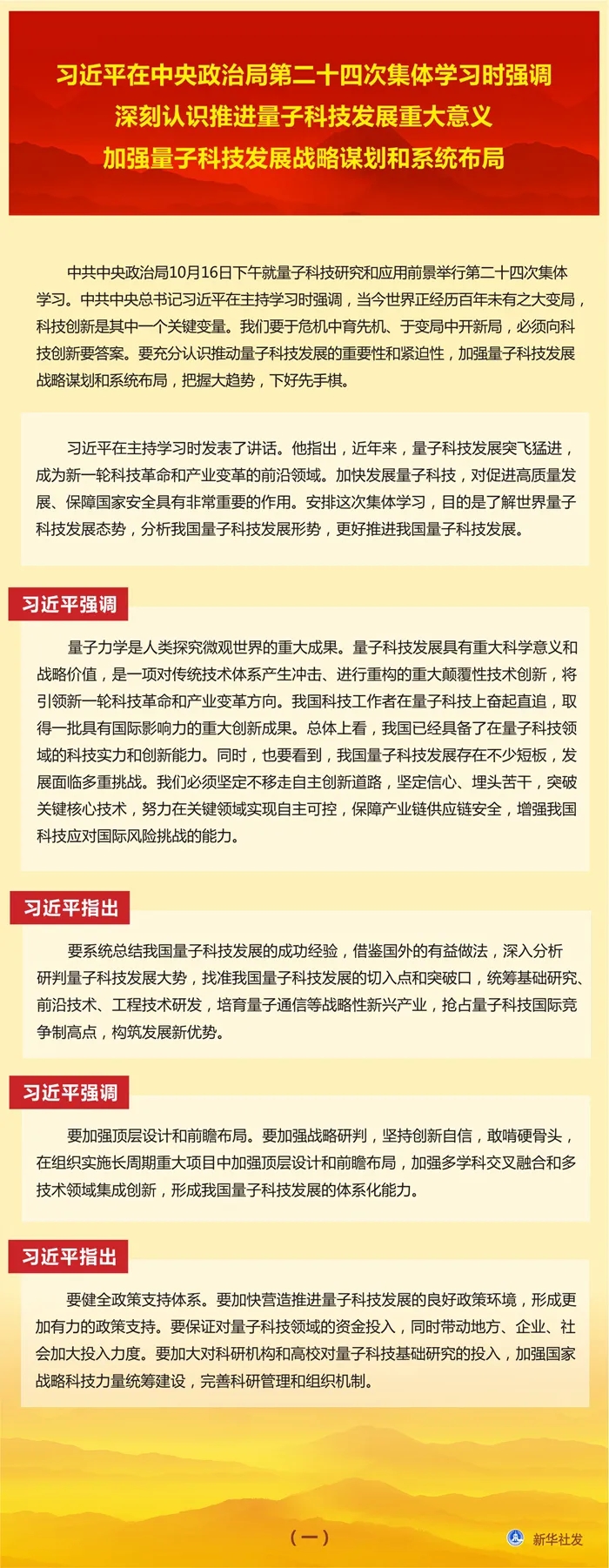 习近平在主持学习时发表了讲话。他指出,近年来,量子科技发展突飞猛进,成为新一轮科技革命和产业变革的前沿领域。加快发展量子科技,对促进高质量发展、保障国家安全具有非常重要的作用。安排这次集体学习,目的是了解世界量子科技发展态势,分析我国量子科技发展形势,更好推进我国量子科技发展。